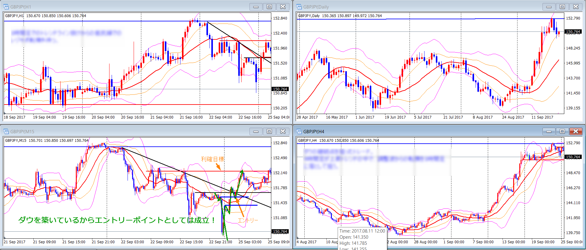 しかし、BBが開き放しだとしても、下図のように、1HでTLを上抜けして、15Mでしっかりダウを築いているのでエントリーポイントとしては成立します。