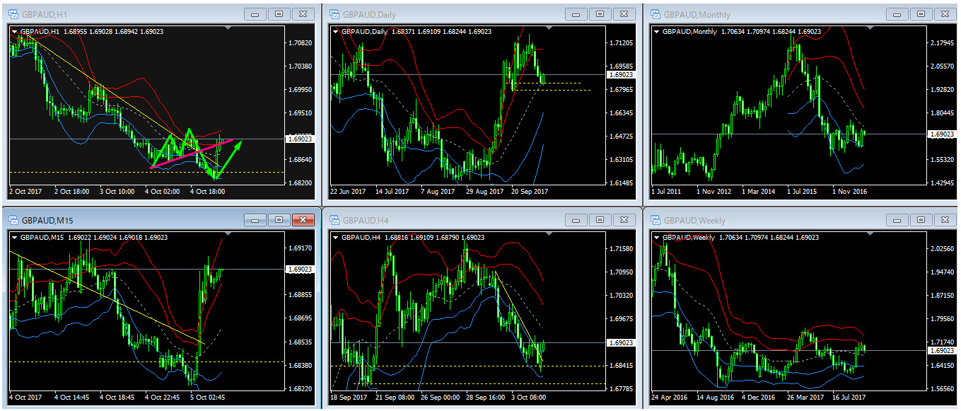 黄色の破線まで達せずに、1Hミドルを上抜いて暫く揉んだという事は、買い勢に押されたという事なので、4Hのトレンドが終了することを示唆しています。