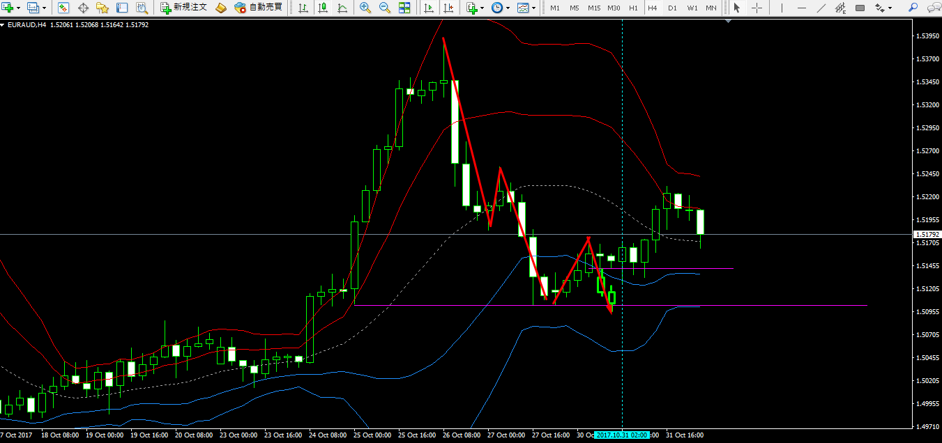 この様な流れが出るためには、少なくても1時間足で紫ラインのところで、上髭(ピンバー)が出るまで待つ必要がありますよね?