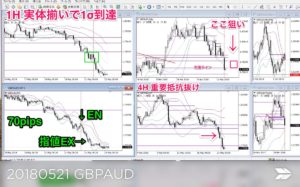 日足ボックスを抜ける前から4Hが下降ダウを作っているので、日足BOXを抜けたら、後は、日足(初動)の流れに合流するので、EXポイントは日足の次の抵抗までです。