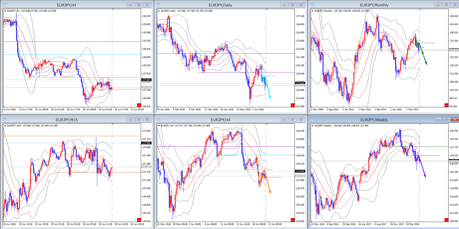 この通貨ペアーは、月足がダウ6番完成、週足もダウ6番完成、日足もダウ6番完成、さらに4時間足もダウ6番完成なので、月足レベルで月足のゴールまで進んでいます。
