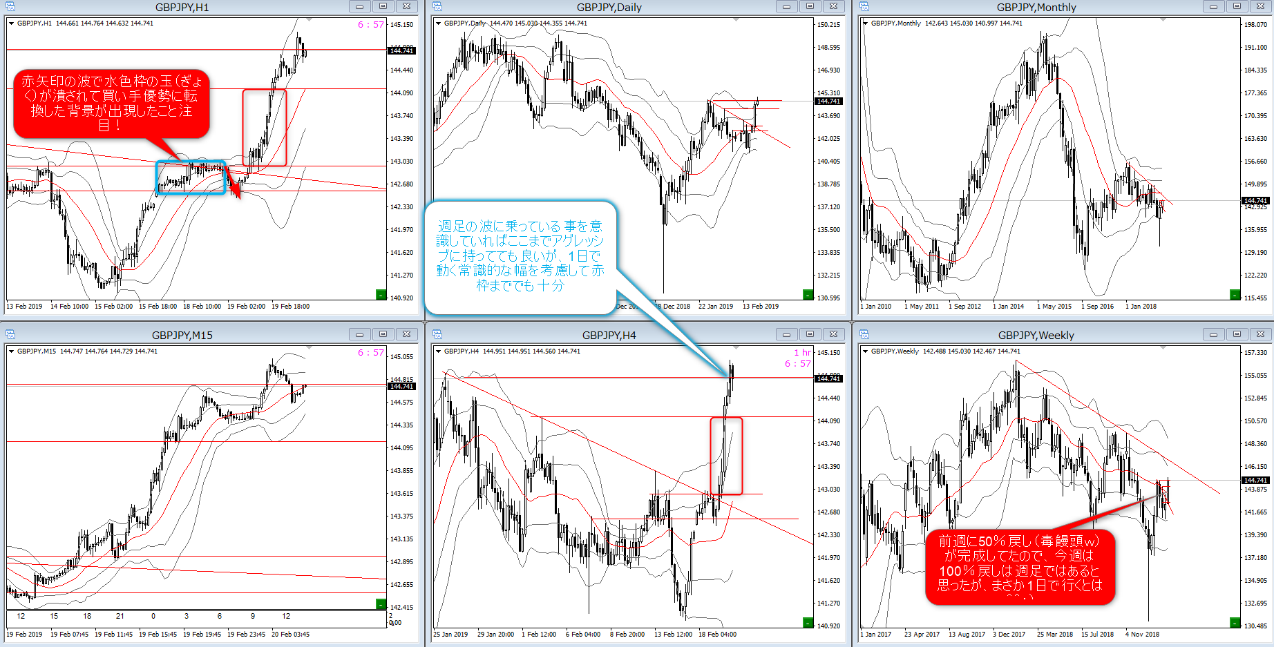 週足が-1σに乗って50%戻していた環境だったので、この後は100%戻す事が容易に予想できました。
