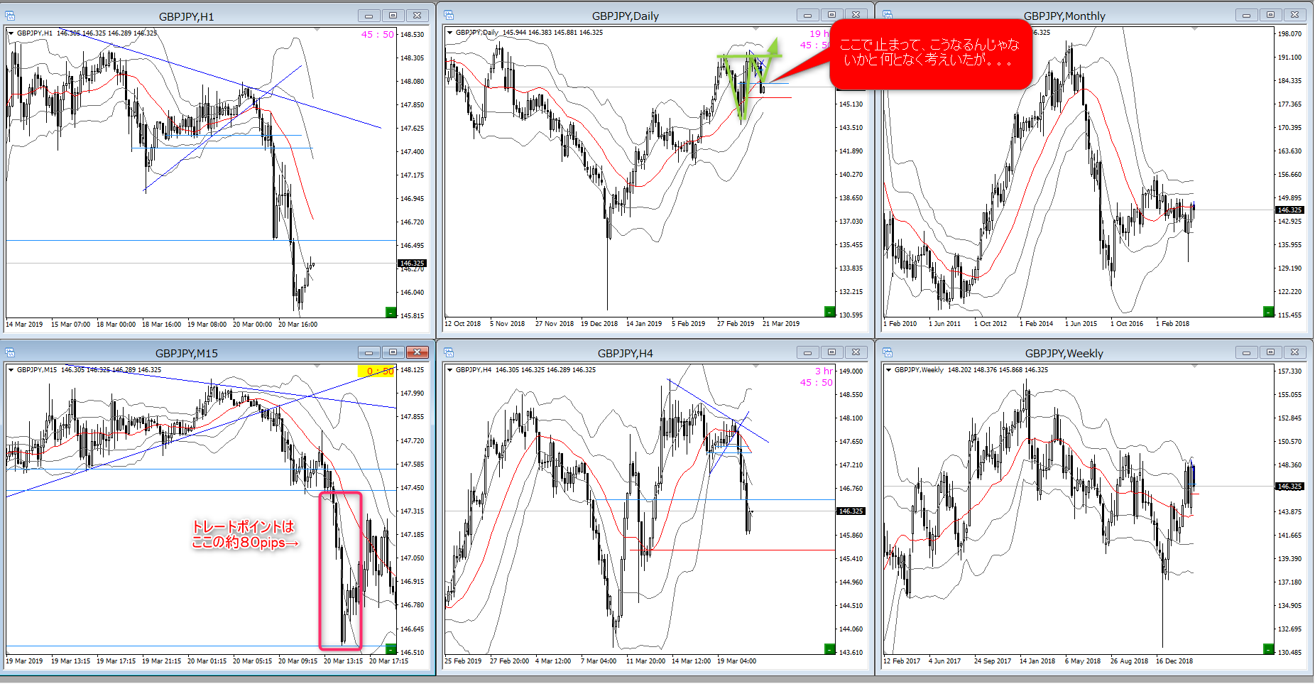 トレードシナリオとしては、エグジットポイントは日足のミドルぐらいまでだと想定していましたが、そこを遥かに越えて週足の半値ぐらいまで行ってしまいました。。。