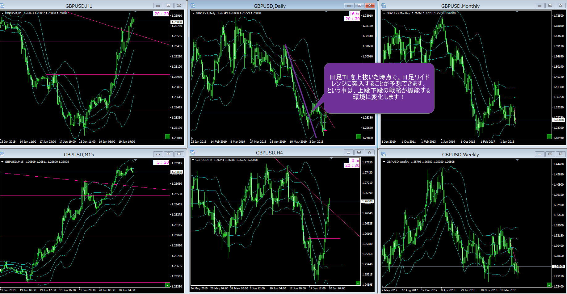 これが出来るようになると、下図のようなトレード戦略が立てられるようになります。(勿論、大型指標なども意識してください)