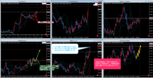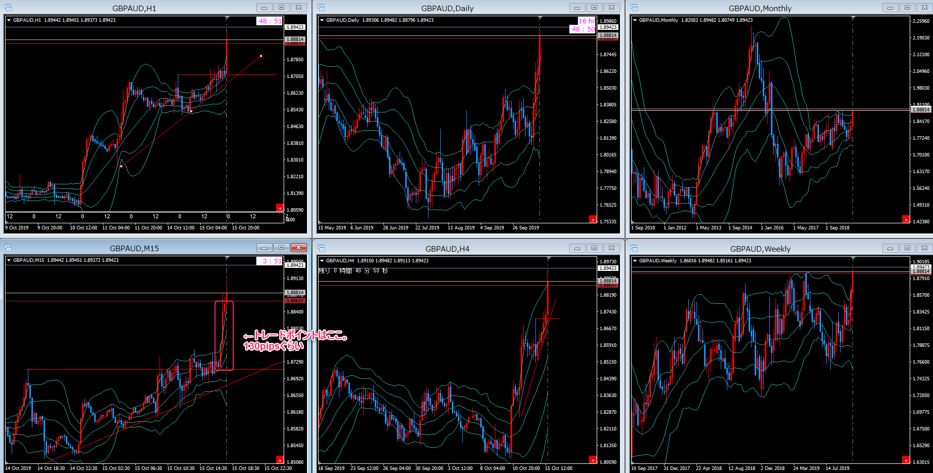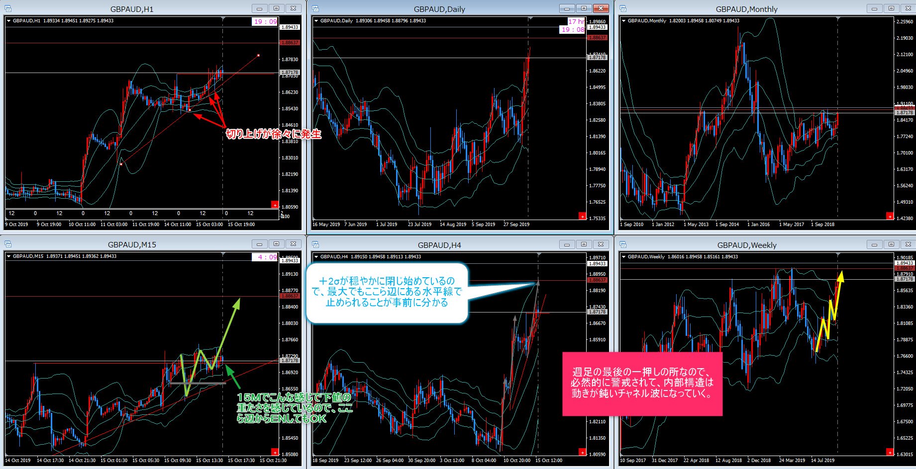 但し、この部分の難しところは、「4時間足の第3波」、「+2σが緩やかに閉じ掛かっている」、「チャネルで動きが鈍い」、という典型的なチャネル波の動きをしていたので、ENタイミングを間違えると、方向性はあっていても、振り落されるという、事が良くある部分になります。