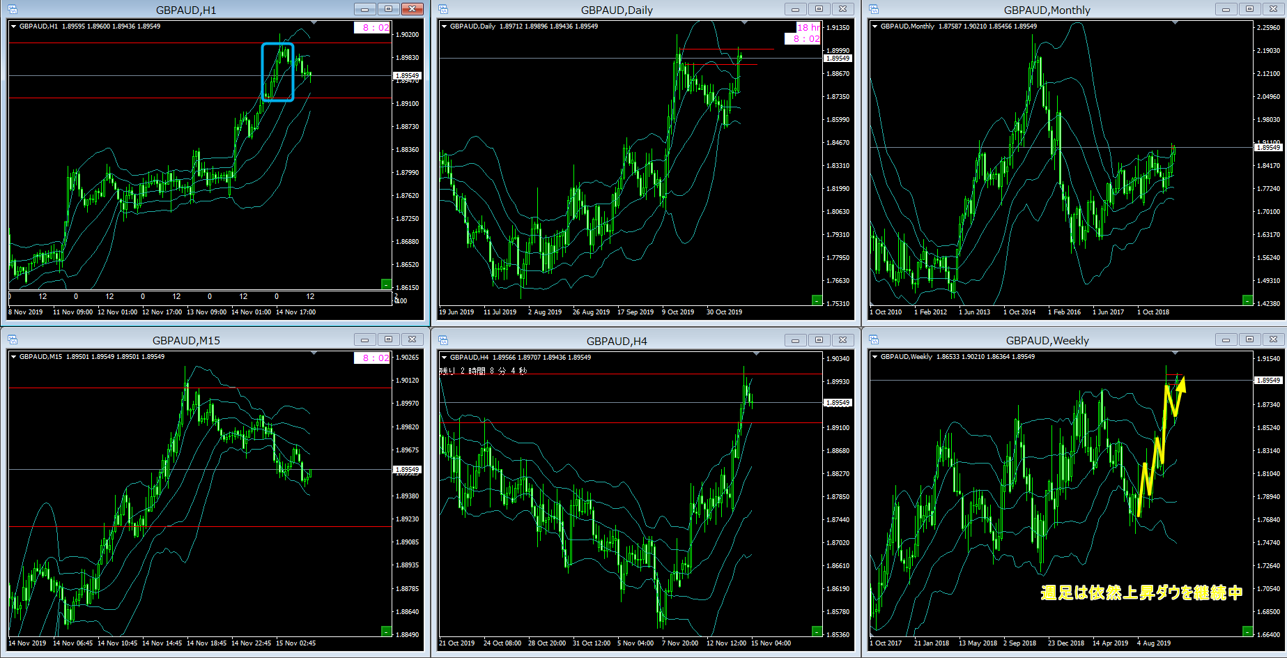 GBP関連通貨ペアーは週足レベルで上昇ダウを作っているので、当然、何週にも渡って監視すべきものです。